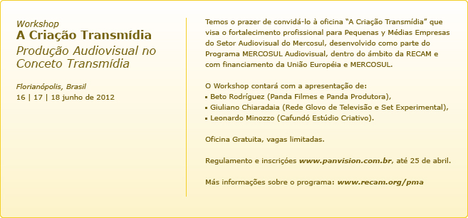 A segunda oficina do Programa Mercosul Audiovisual, com financiamento da União Européia e MERCOSUL, ocorrerá no Brasil, na cidade de Florianópolis, de 16 a 18 de junho de 2012. Entitulada "A criação transmídia – produção audiovisual no conceito transmídia" a oficina de 3 dias, com total de 24h de atividades, contemplará 30 profissionais de Pequenas e Médias Empresas do Setor Audiovisual com atuação no Mercosul